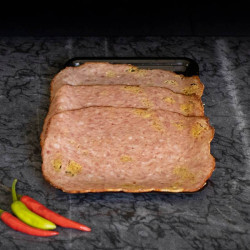 Gebraden gehakt met een vleugje mosterd, varkensproduct.