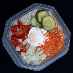 Ambachtelijke bereide rundvlees salade. De soort die we in de verkoopwagen verkopen, voor ongeveer 4 personen. Gegarneerd in een kilobak.